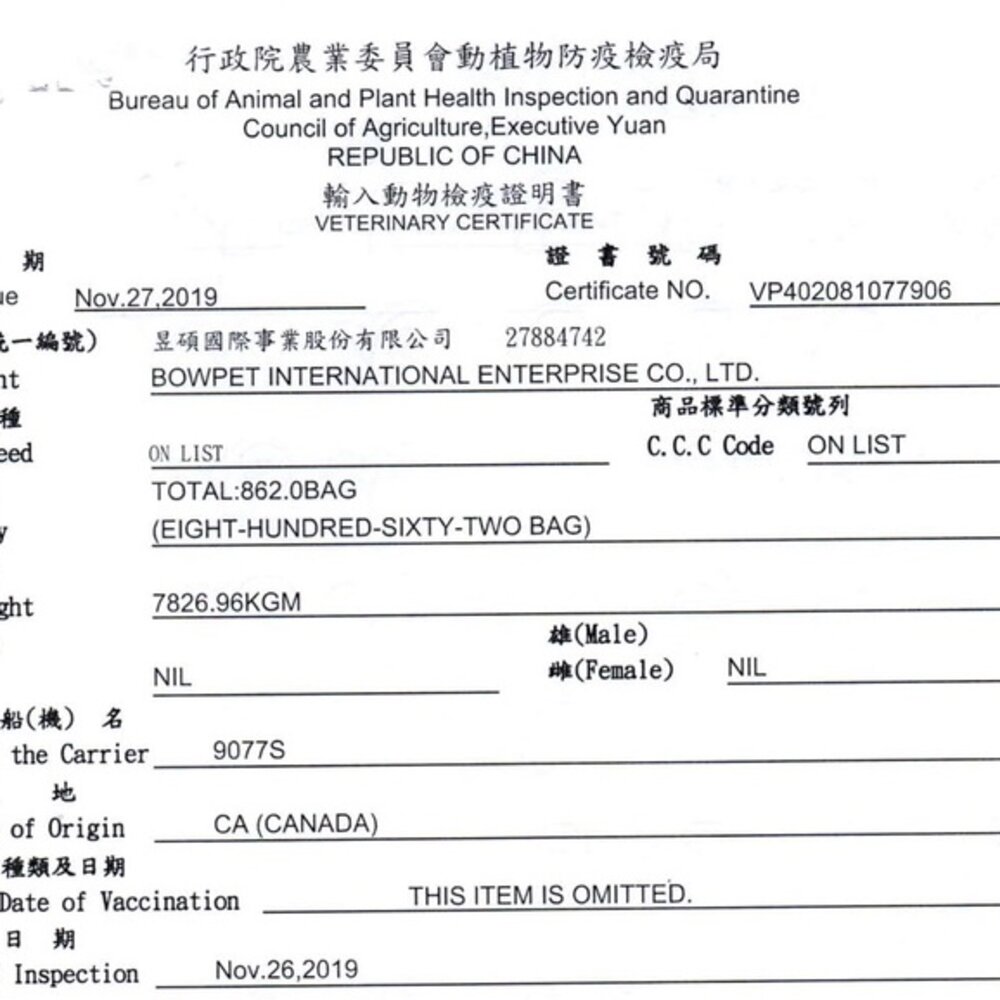 芥花油(以混合生育酚和檸檬酸保鮮),完整亞麻籽,鷹嘴豆,