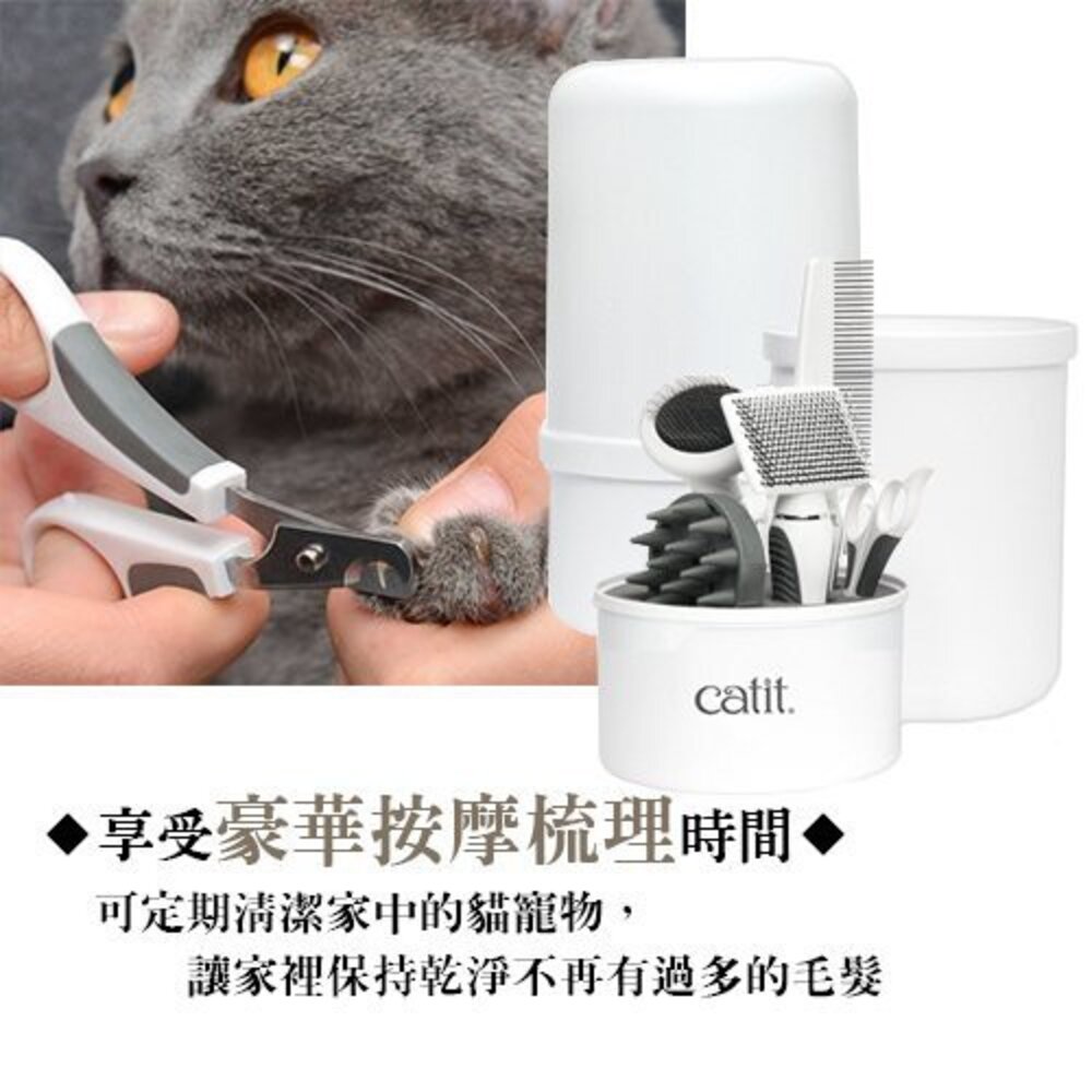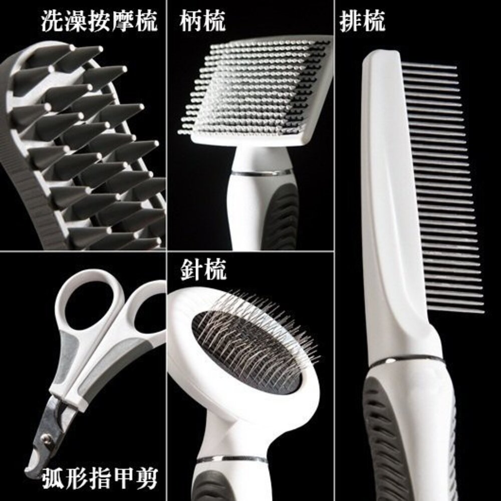●商品描述● 特色 ◆修容組含每一個日常梳理工具:洗澡按摩梳、柄梳、針梳、排梳、弧形指甲剪。 ◆修容組的蓋子可當做臨時的收毛器具。 ◆修容工具直立存放,可保護刷子。 ◆經常梳理毛髮可減少脫毛,梳毛時也是與寵物相處的寶貴時光。 ◆材質不含雙酚A。 ■有5種配件 洗澡按摩梳 柄梳 針梳 排梳 弧形指甲剪 適用對象: 犬貓適用