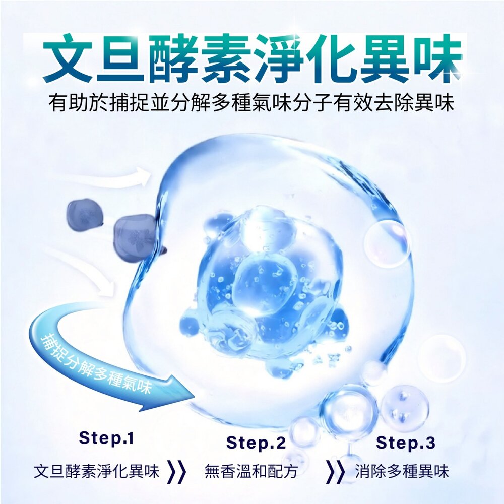 A: 是「分解活性」。產品中的柚子酵素與消臭分子能直接包裹並分解尿液中的氨(阿摩尼亞)與硫化物,而非香精覆蓋。因成分來自文旦,無添加人工香精,對嗅覺敏感的毛孩不會造成負擔或呼吸道刺激。