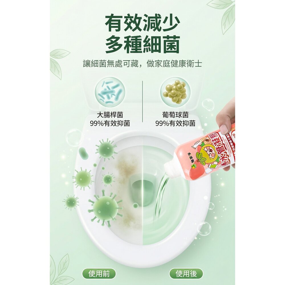 1.可每月固定倒入半瓶,靜待1小時,即可沖水使用。