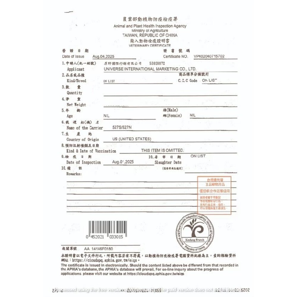營養分析:粗蛋白質最少36.0%、粗脂肪最少14.0%、粗纖維最多4.0%、水份最多10.0%、DHA最少0.05%、維生素E最少 300IU/kg、牛磺酸最少 0.10%、Omega-6脂肪酸最少2.00%、Omega-3脂肪酸最少1.20%