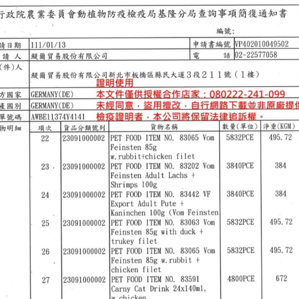 成分:肉類和動物副產品(5% 雞柳)、植物副產品、礦物質。