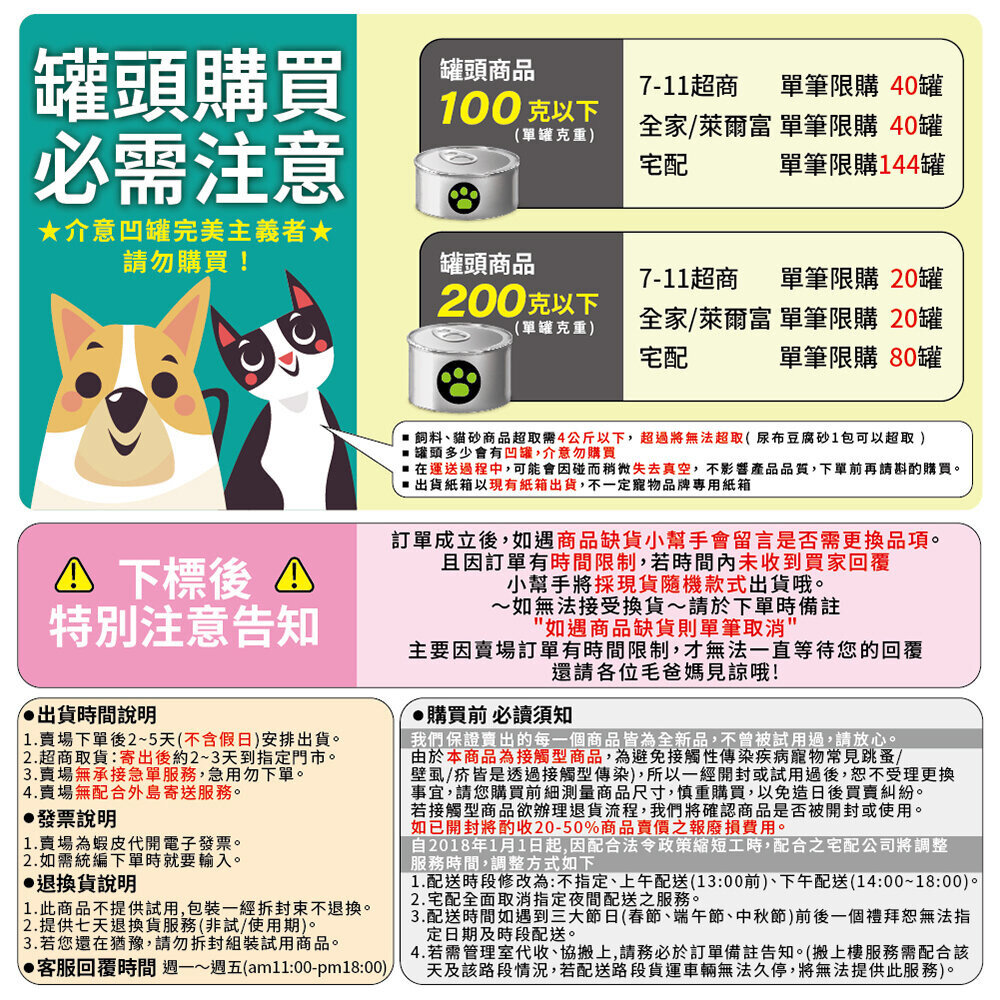 (四)因貓砂免運組合,以及飼料、罐頭過重,和貓砂盆、狗便盆,或是商品過大/過重的,