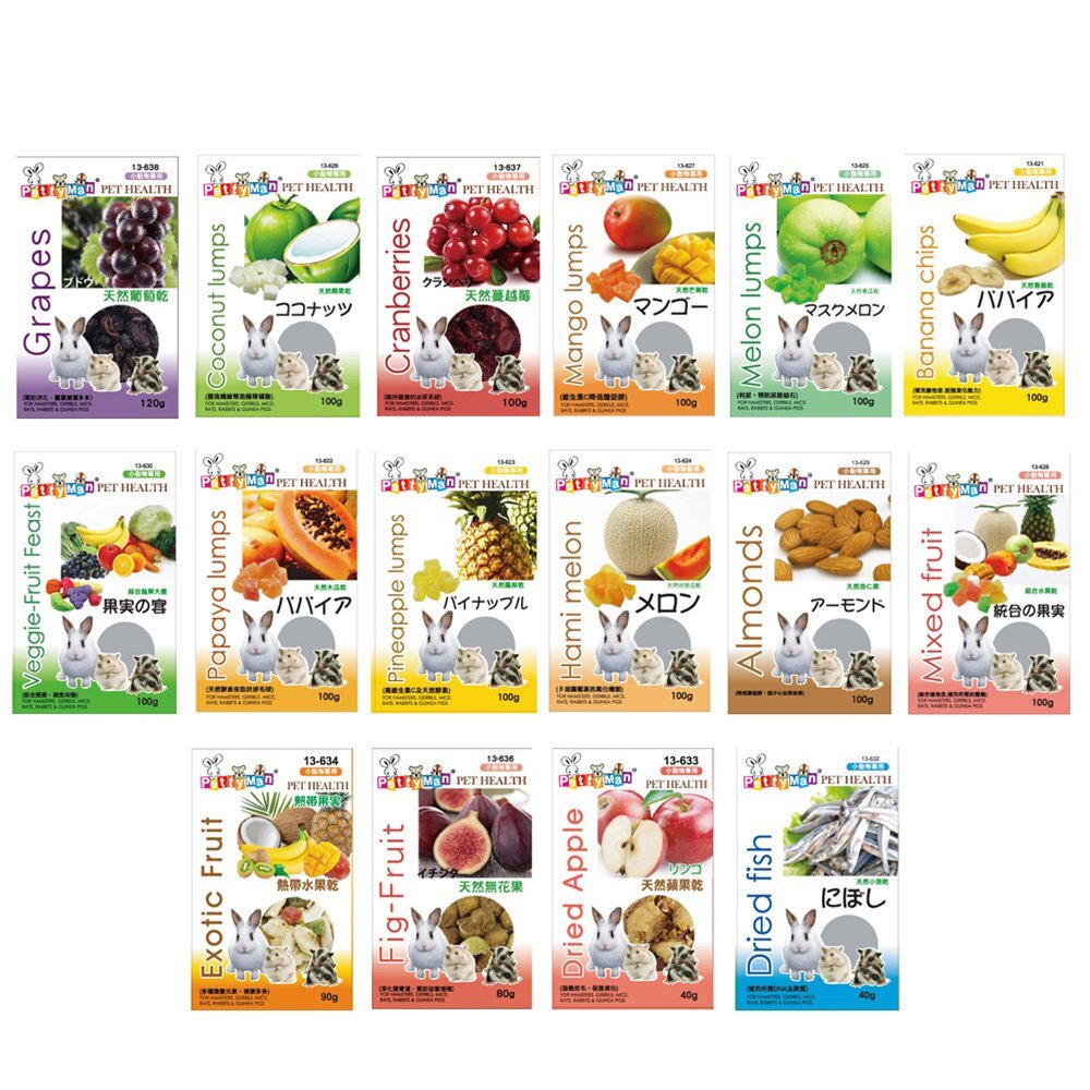 以多種水果乾燥製成,香甜可口,含多種維他命、礦物質及纖維素,補充小動物所需的營養,適合所有囓齒類小動物。