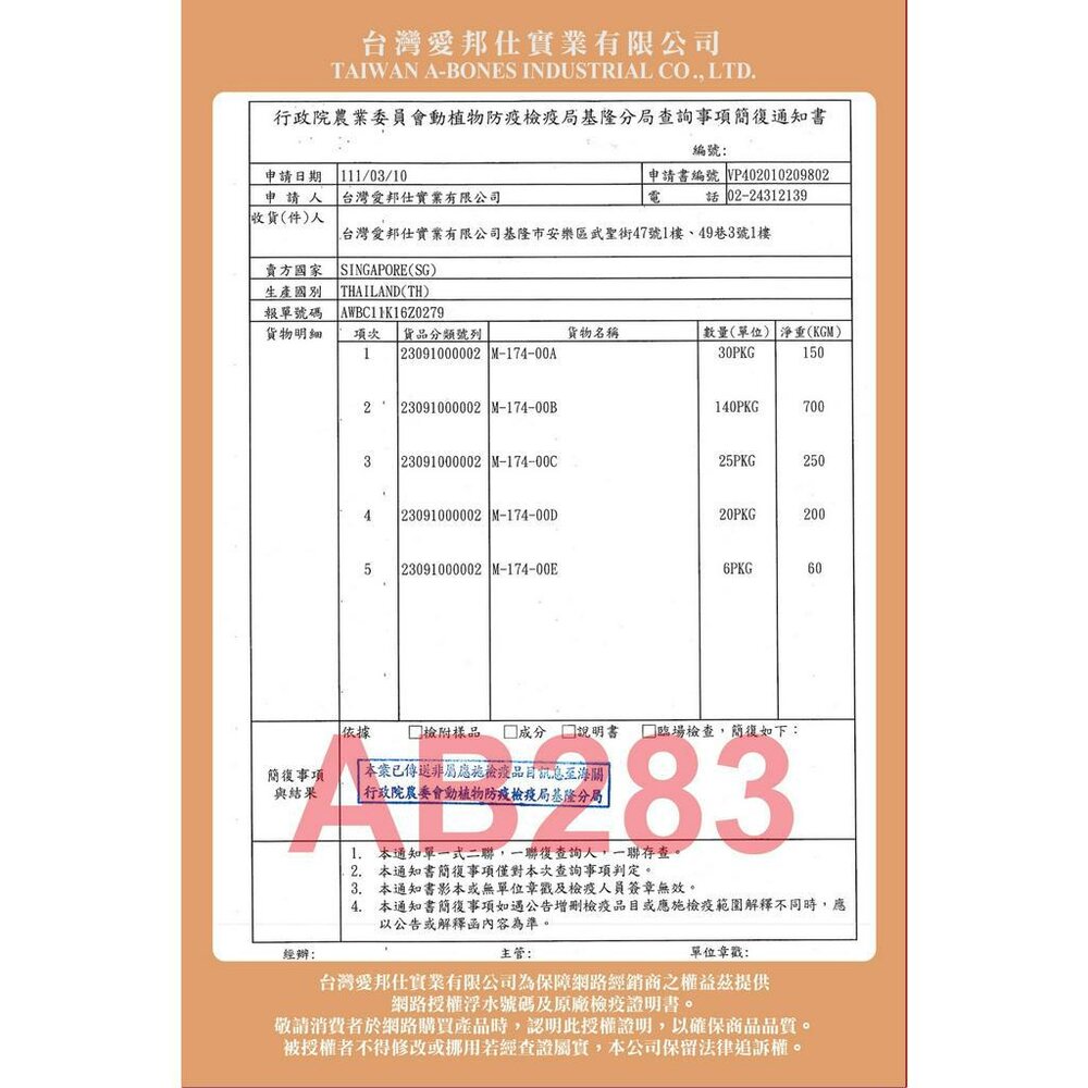 營養標示及含量:粗蛋白質 45.7%↑,粗脂肪 31.4%↑,粗纖維 8.2%↓,粗灰分 7.4%↓,水份 3%↓。
