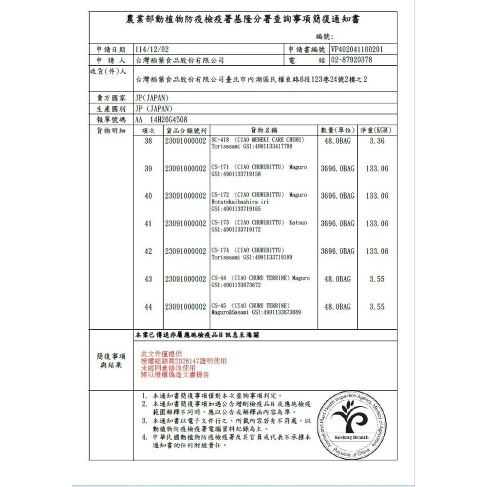 (二) 境外商品不得隨貨贈送應施檢疫物。