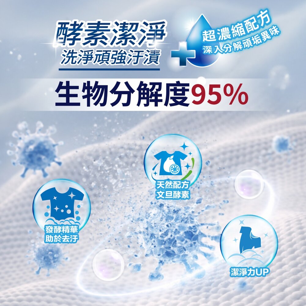 A:利用文旦皮萃取出的脂肪分解酶與蛋白分解酶。這些酵素能主動鎖定汗漬、血跡、奶垢或油脂,將其分解成細小分子後隨水沖走,而非單靠化學界面活性劑強行剝離。