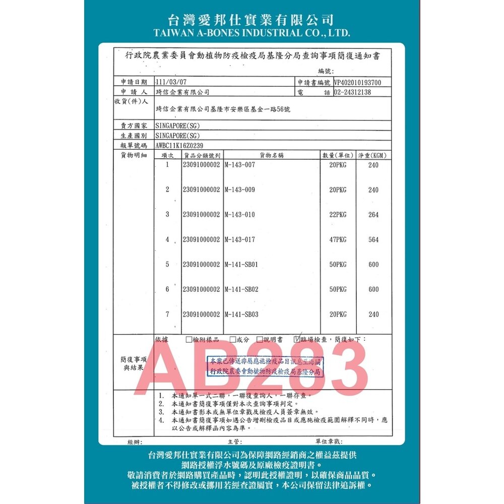 營養成份及含量: 蛋白質 7.5%↑,粗脂肪 4.5%↑,粗纖維 4.5%↓,粗灰分 3.3%↓,水份 6.5%↓。