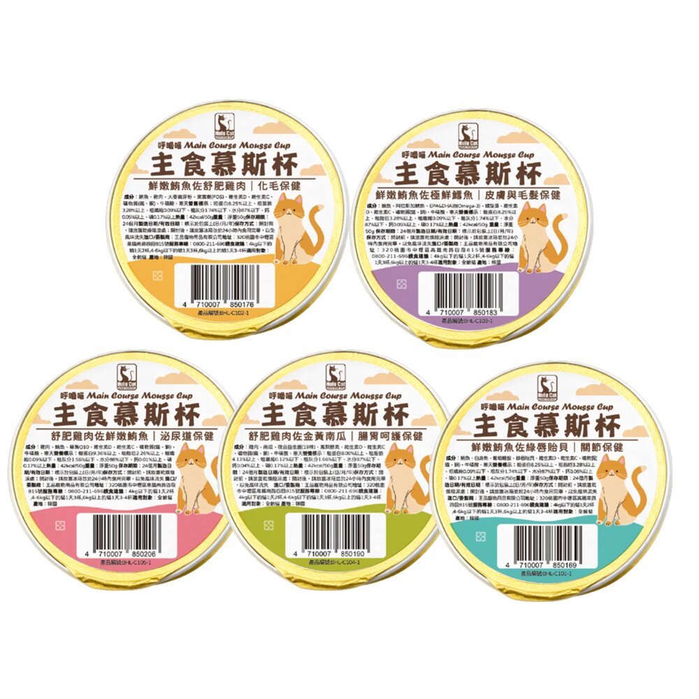 主成份:鮪魚、雞肉、大麥嫩芽粉、果寡糖 (FOS)、維生素D、維生素C、礦物質(鐵、銅)、牛磺酸、寒天