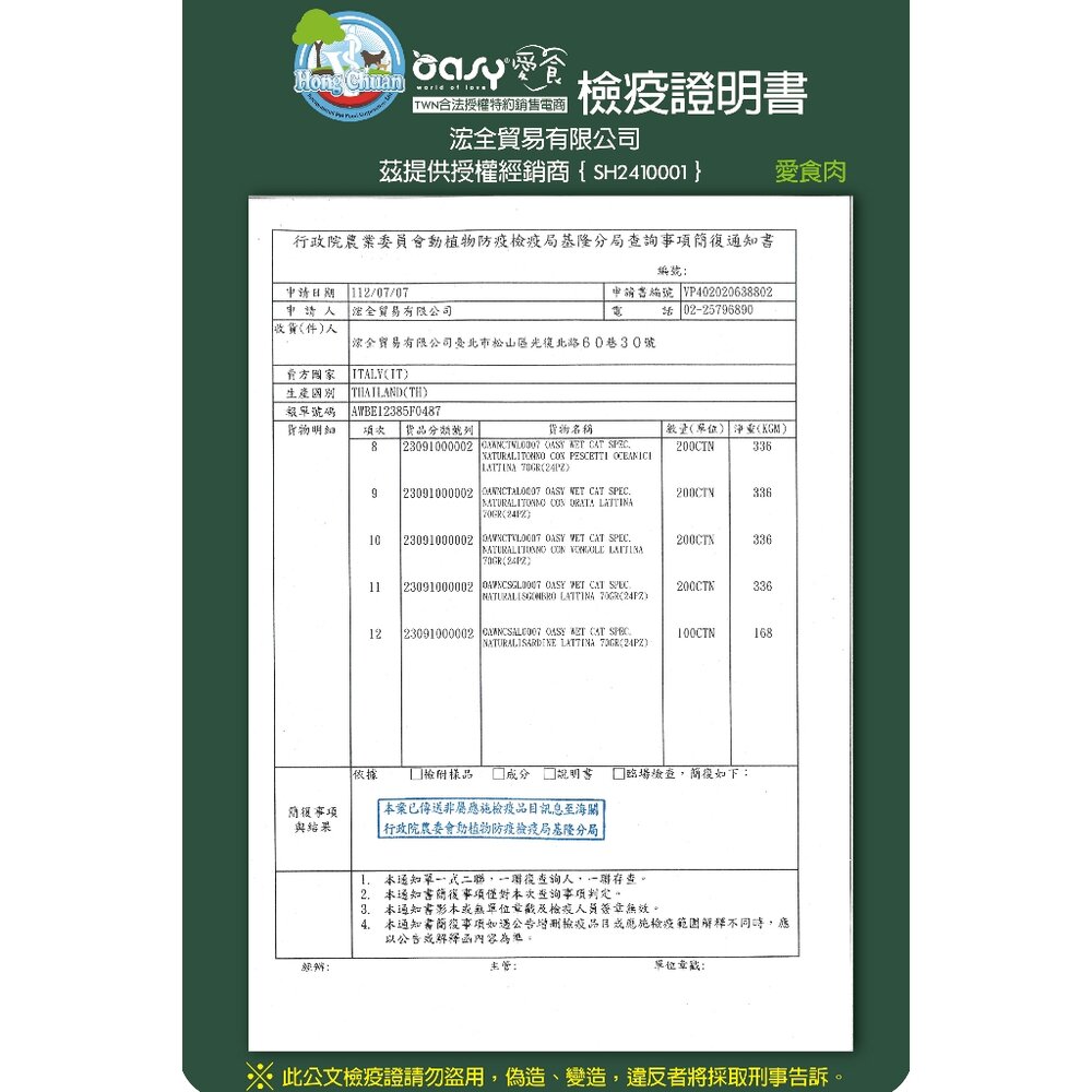 (二) 境外商品不得隨貨贈送應施檢疫物。