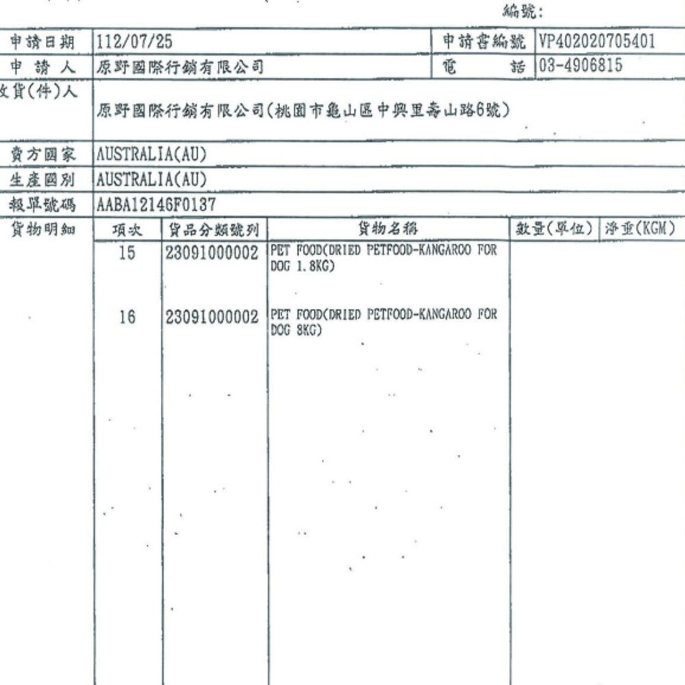-成分 : 袋鼠肉、原型袋鼠肉凍乾、蠶豆、鷹嘴豆、豌豆蛋白、