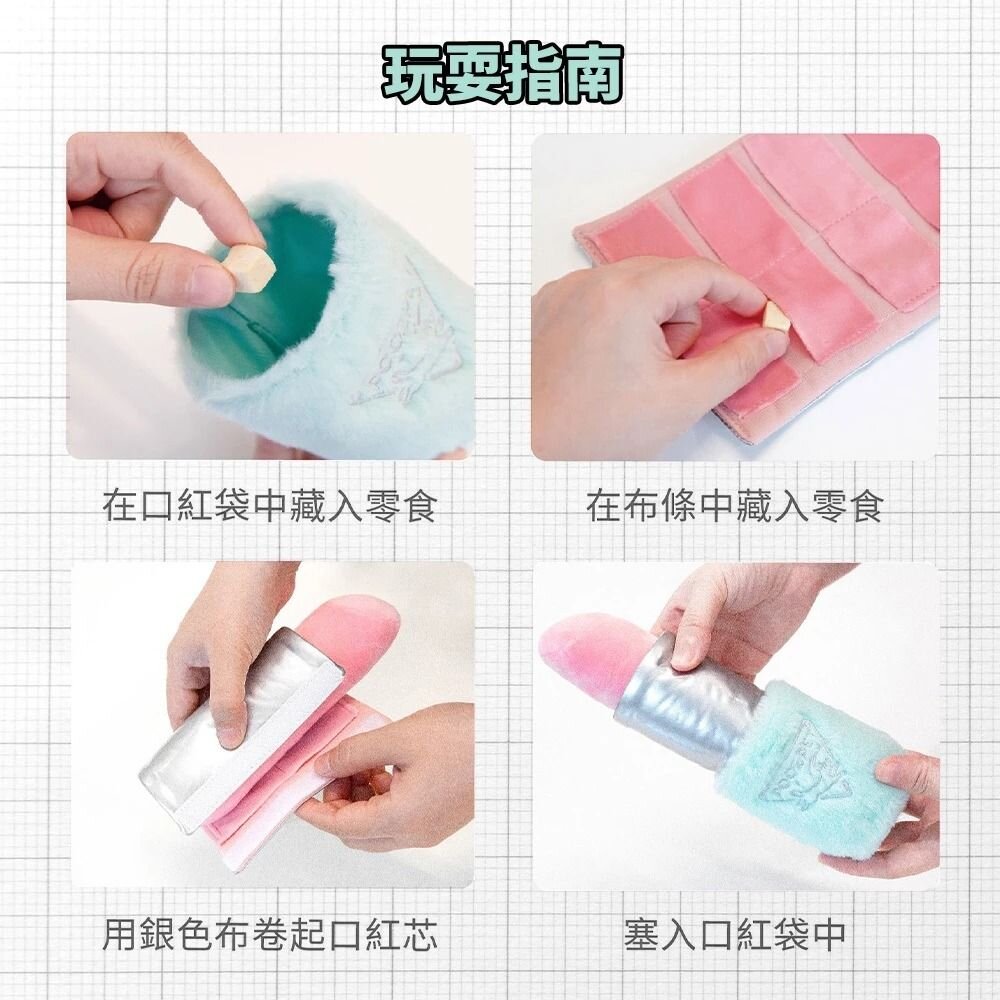 💄口紅玩具可分為三部分,外層口紅袋有響紙,中層帶有藏食布條,口紅芯捏叫發聲。