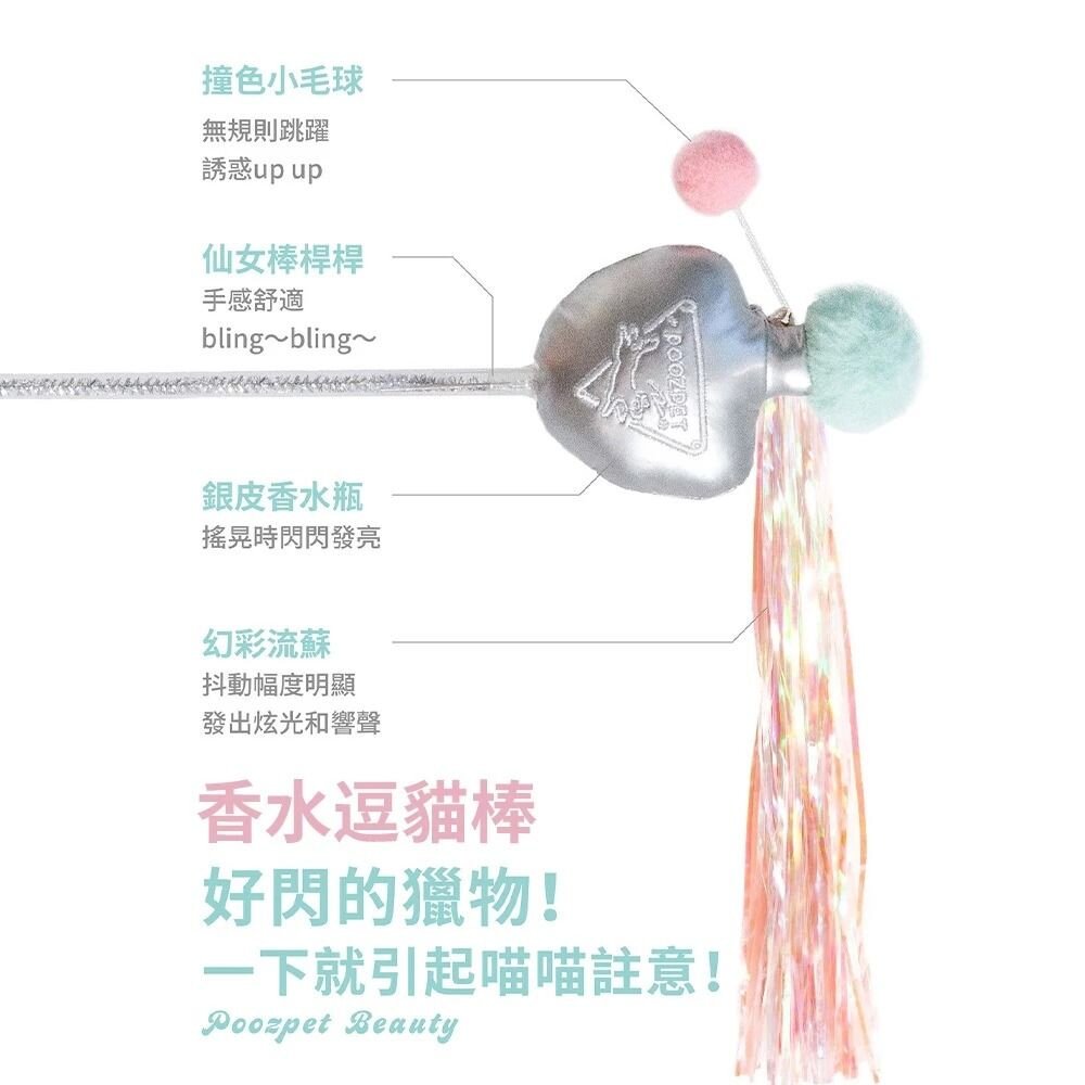 💄香水‧逗貓棒針對貓咪喜歡光亮點的天性,選用了幻彩流蘇、銀色香水瓶、撞色毛球和仙女棒桿子。