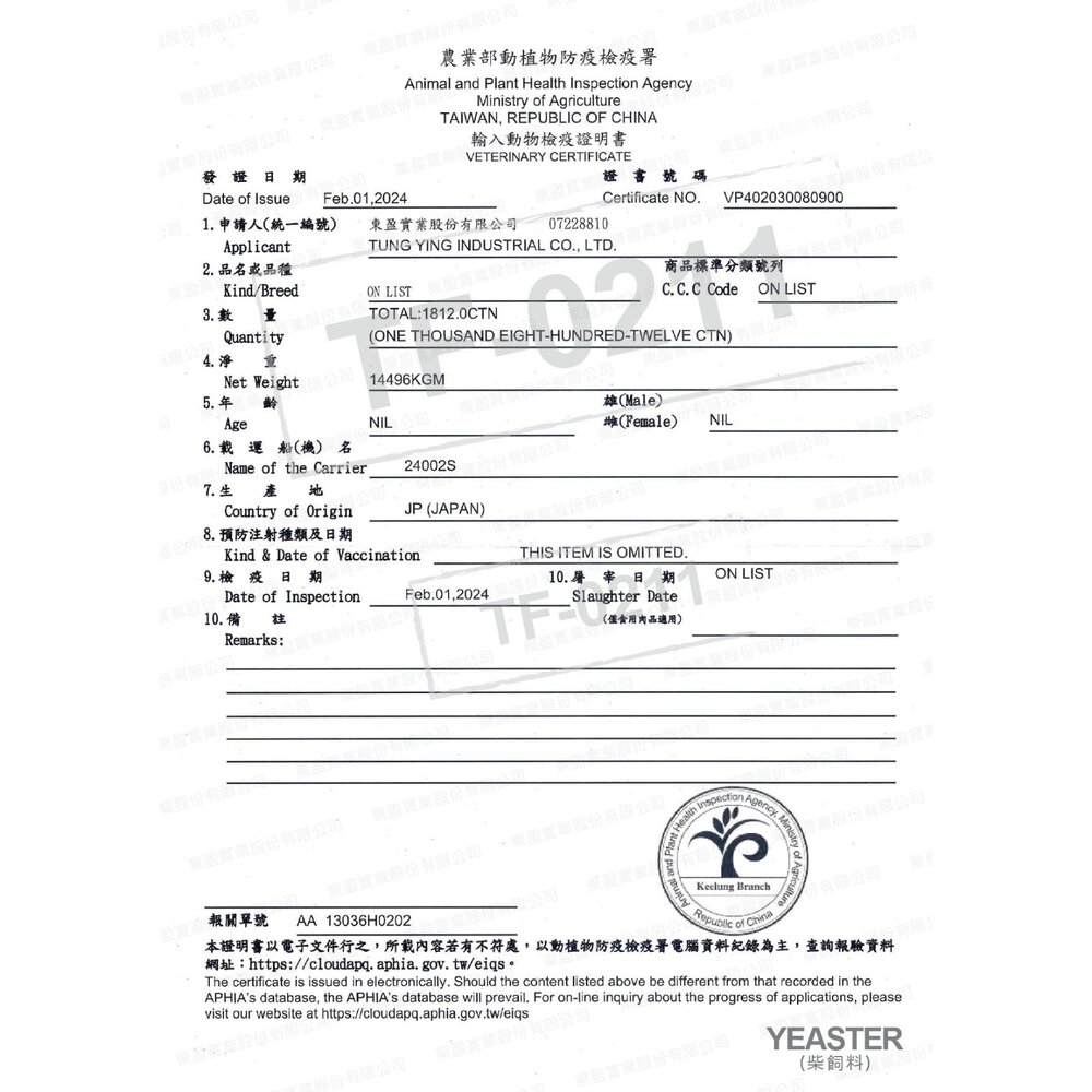營養分析質:蛋白質24.0%↑,脂質9.0%↑,粗纖維4.5%↓,灰份9.0%↓,水份10%↓,鈣1.2%↑,磷1.0%↑,鈉0.3%↑,亞麻油酸1.8%↑,維生素A 10,000IU/kg↑,維生素E 100IU/kg↑,維生素B1 4.0mg/kg↑,維生素B2 6.5mg/kg↑,代謝能335kcal/↑100g