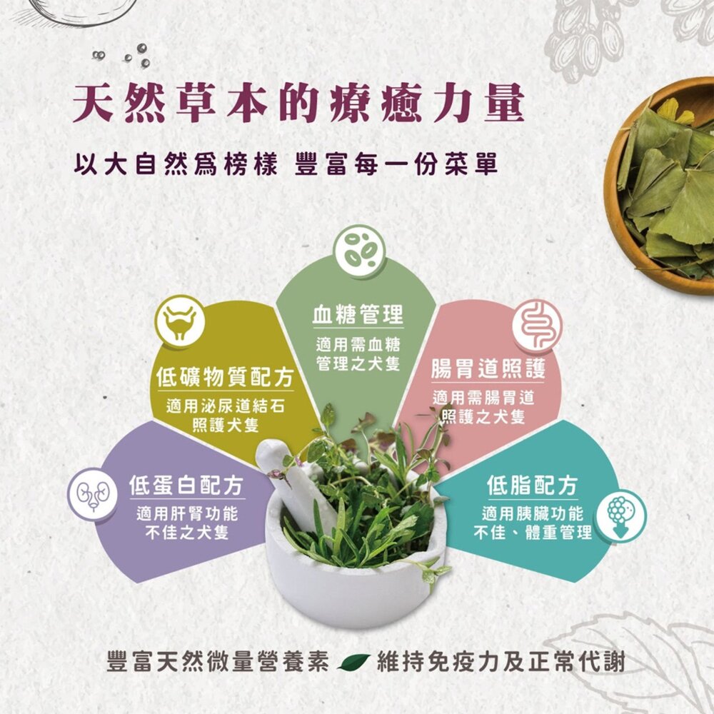 主要原料:雞肉(24%)、雞胗(15%)、馬鈴薯、胡蘿蔔(8%)、櫛瓜、南瓜(8%)、雞皮(5%)、哈密瓜、蘋果、亞麻籽油、椰子粉、乾燥蒲公英、乾燥樺樹葉、乾燥歐芹、奇亞籽、乾燥萬壽菊、乾燥蕁麻、乾燥牡蠣殼、乾燥海藻、礦物質