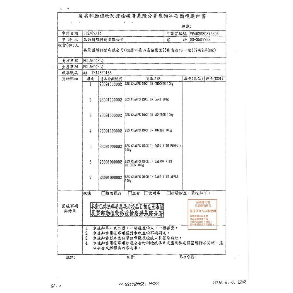 商品成份:肉類和動物副產品 54%(26% 羊肉)、1%蘋果、植物蛋白萃取物、維生素、礦物質