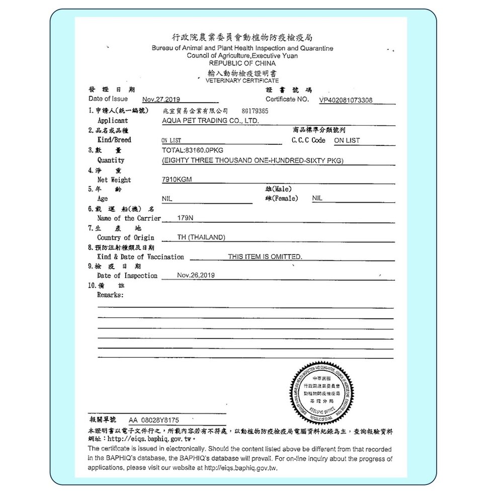 營養添加劑/千克: 維生素A 1325 U.I, 維生素D3 110 U.I, 維生素E 15毫克, 牛磺酸 160毫克。