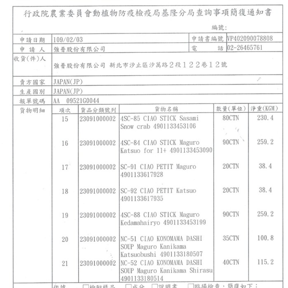 雞肉,蟹味魚糕,扇貝提取物,柴魚片,醣類(低聚醣等),植物油脂,增稠劑(加工澱粉),礦物質,