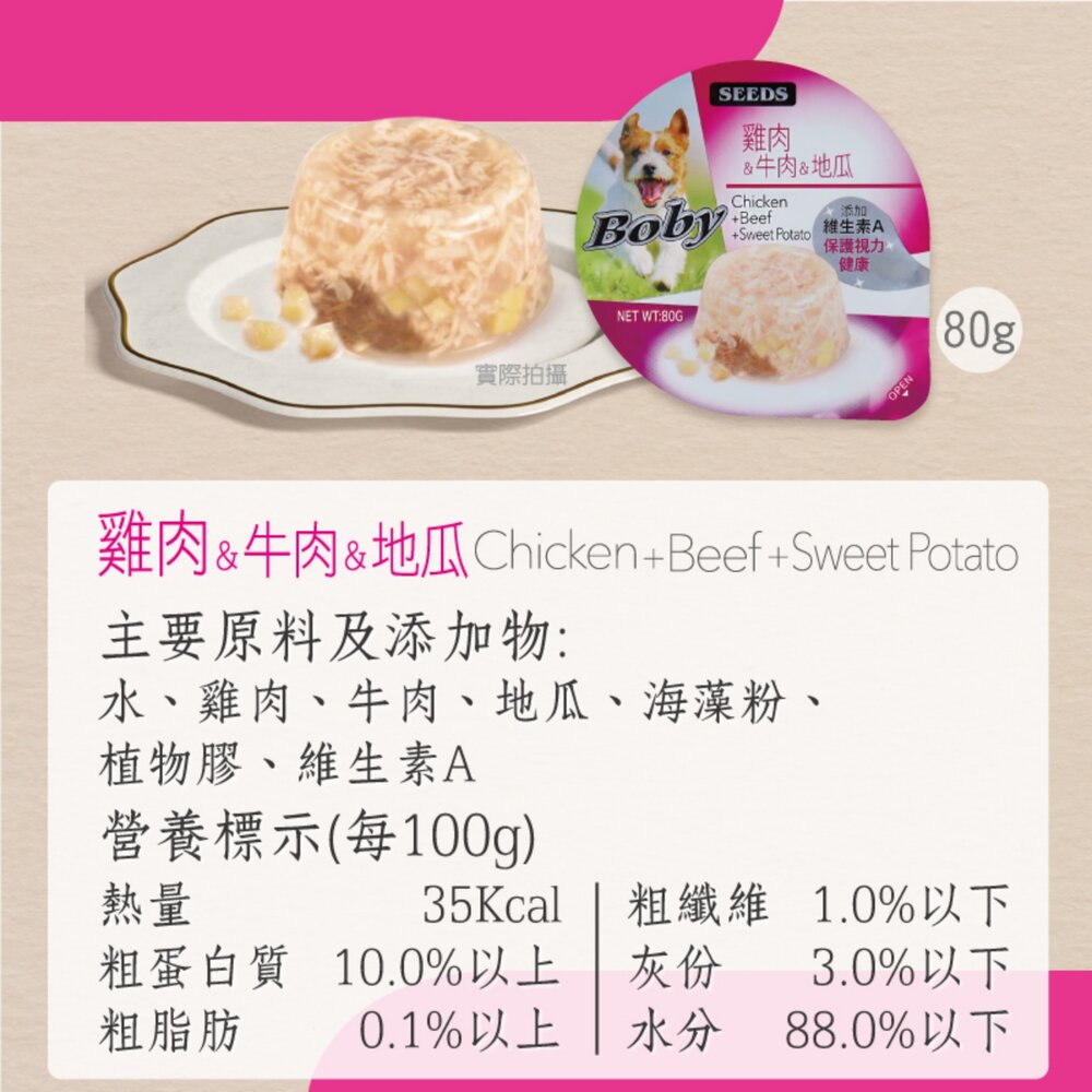 主要原料及添加物:水、雞肉、牛肉、地瓜、海藻粉、植物膠、維生素A