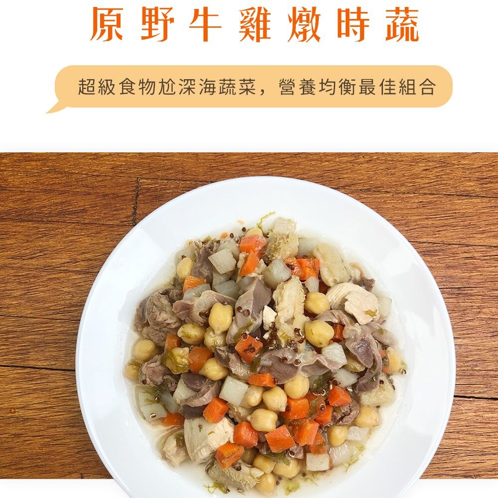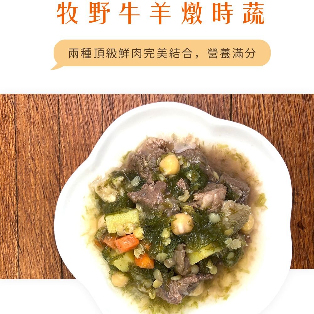 原料:水、羊肉、牛肉、地瓜、牛肚、水晶藻、鷹嘴豆、紅蘿蔔、紅扁豆、苦茶油