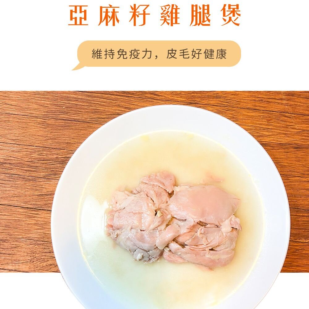 原料:台灣去骨去皮雞腿肉、亞麻籽粉、葵花籽油、熬煮高湯