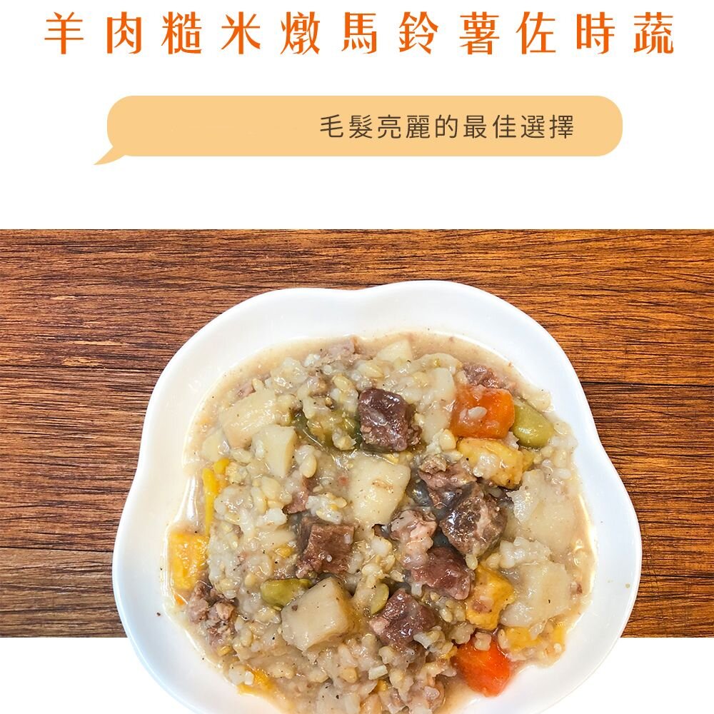原料:羊肉、地瓜丁、馬鈴薯丁、糙米、紅蘿蔔丁、毛豆仁、亞麻籽粉、黑芝麻粉、葵花籽油、熬煮高湯