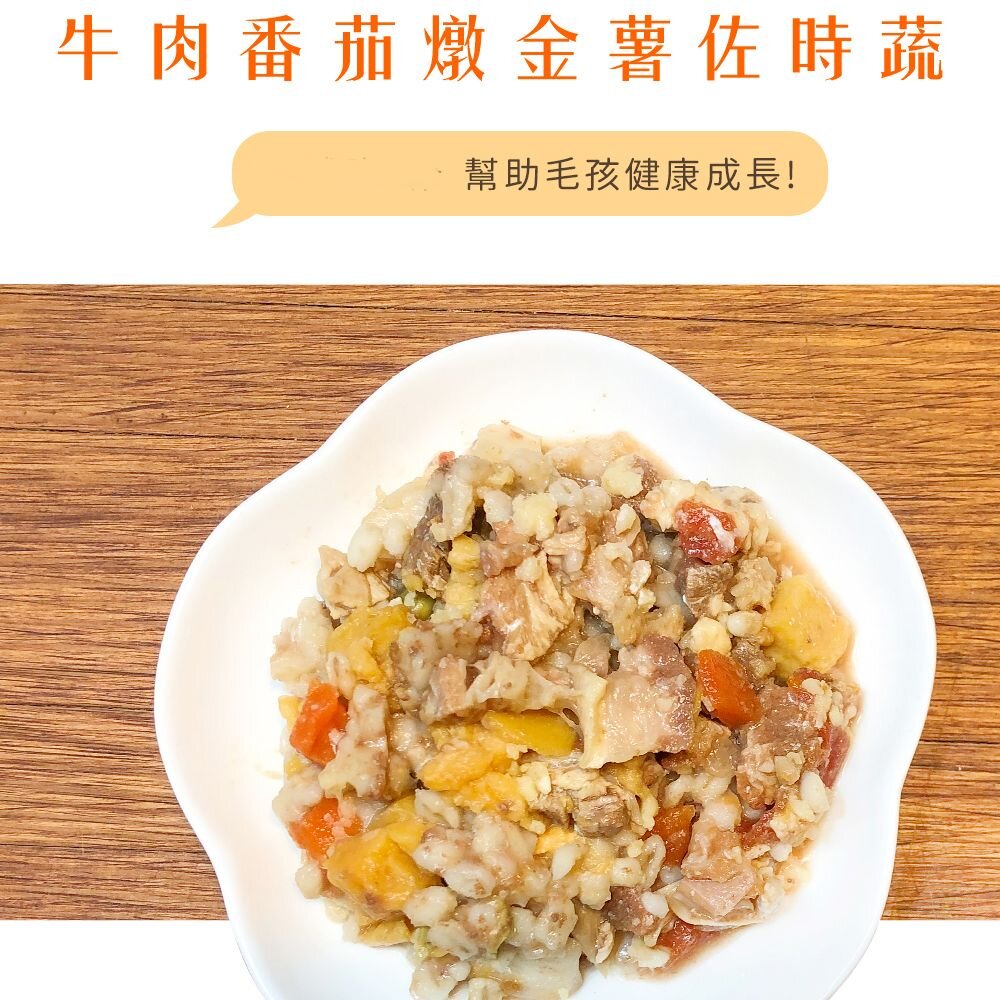 原料:牛腩肉、地瓜丁、番茄丁、薏仁、紅蘿蔔丁、馬鈴薯丁、毛豆仁、亞麻籽粉、葵花籽油、熬煮高湯