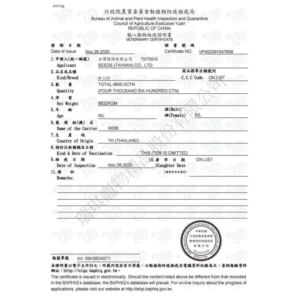 主要原料及添加物:雞肉、水、燕麥、木薯澱粉、瓜爾膠、乾燥菠菜、維他命A