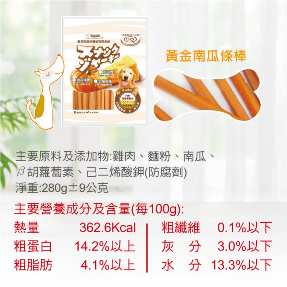 主要原料及添加物:雞肉、麵粉、南瓜、ß胡蘿蔔素、己二烯酸鉀( (防腐劑)