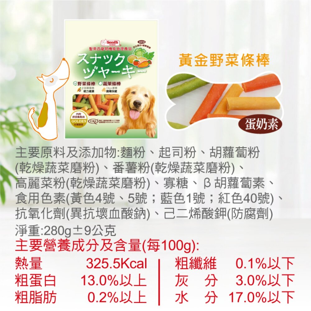 主要原料及添加物: 麵粉、起司粉、胡蘿蔔粉(乾燥蔬菜磨粉)、番薯粉(乾燥蔬菜