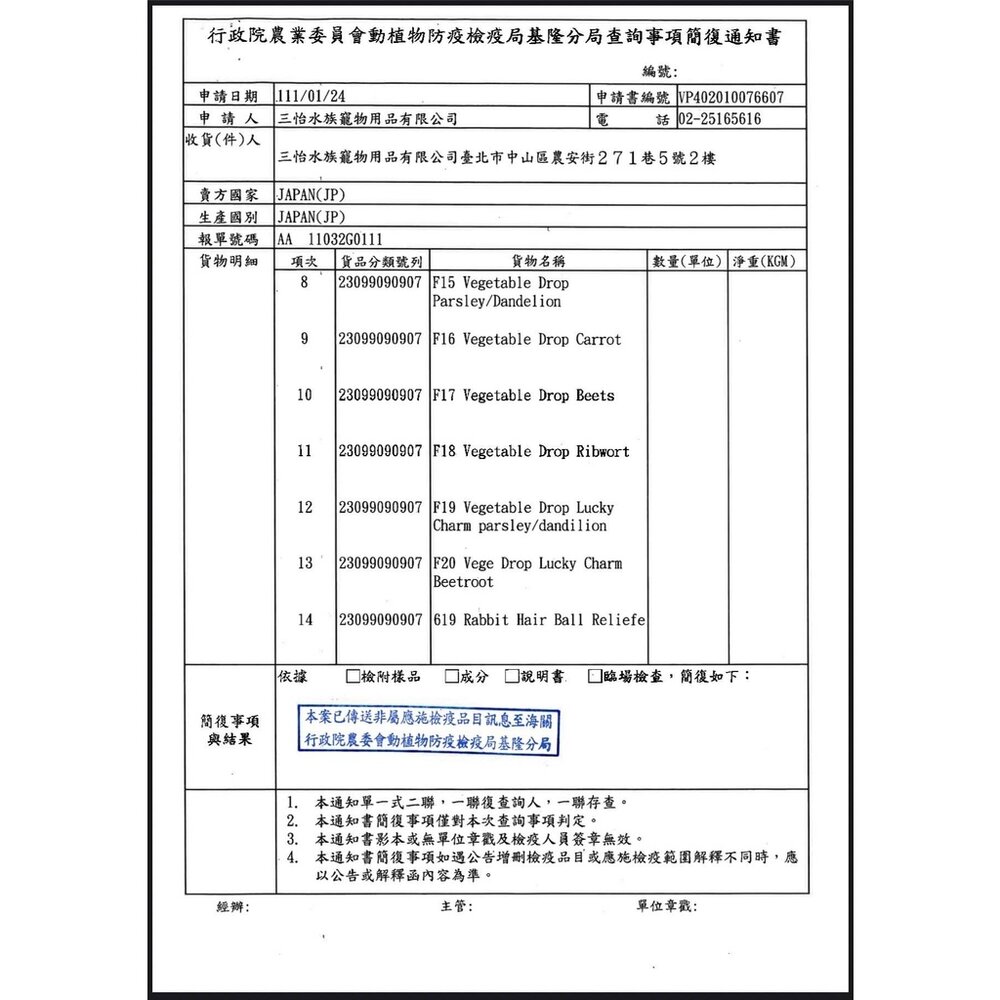 (二) 境外商品不得隨貨贈送應施檢疫物。
