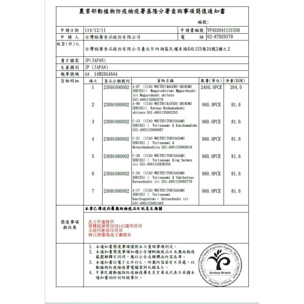 營養分析表:粗蛋白質12.5%以上,粗脂肪0.5%以上,粗纖維 0.1%以下,粗灰份 1.5%以下,水份85.5%以下