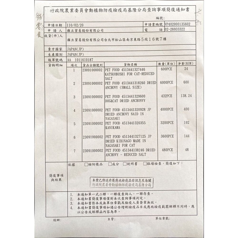 (二) 境外商品不得隨貨贈送應施檢疫物。
